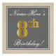 Cette affiche simple et élégante de fête d’anniversaire comporte un message personnalisé comme "Nom-Voici le 8e anniversaire!" (avec le "8e" ayant un look de couleur fausse/imitation or) dans une zone de couleur gris carré avec un contour de bordure simple. Le nom est dans un élégant texte de couleur blanche en forme de script, et peut être personnalisé. Une affiche de fête d'anniversaire personnalisée comme celle-ci pourrait peut-être servir de décoration à une fête organisée pour quelqu'un qui célèbre son huitième anniversaire. [~Z0000241]