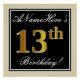Cette affiche simple et élégante de fête d’anniversaire comporte un message personnalisé comme "AnameHere’s 13th Birthday!" (avec le "13th" ayant un look de couleur fausse/imitation or) dans une zone carré de couleur noire avec un contour de bordure simple. Le nom est dans un élégant texte de couleur blanche en forme de script, et peut être personnalisé. Une affiche de fête d'anniversaire personnalisée comme celle-ci pourrait peut-être servir de décoration à une fête organisée pour quelqu'un qui célèbre son treizième anniversaire. [~Z0000236]