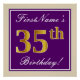 Cette affiche simple et élégante de fête d’anniversaire comporte un message personnalisé comme "35e anniversaire de prénom!" (avec le "35e" à l’allure fausse/imitation dorée) dans une zone carré de couleur violette avec un contour de bordure simple. Le nom est dans un élégant texte de couleur blanche en forme de script, et peut être personnalisé. Une affiche de fête d'anniversaire personnalisée comme celle-ci pourrait peut-être servir de décoration à une fête organisée pour quelqu'un qui célèbre son trente-cinquième anniversaire. [~Z0000238]