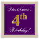 Cette affiche simple et élégante de fête d’anniversaire comporte un message personnalisé comme "4e anniversaire du prénom !" (avec le "4e" à l’allure fausse/imitation dorée) dans une zone carré de couleur violette avec un contour de bordure simple. Le nom est dans un élégant texte blanc de couleur script, et peut être customisé. Une affiche de fête d'anniversaire personnalisée comme celle-ci pourrait peut-être servir de décoration à une fête organisée pour quelqu'un qui célèbre son quatrième anniversaire. [~Z0000238]