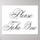 Cette belle et intemporelle signalisation horizontale "Please Take One" pour table de programme ajoute une élégance simple à toute réception de mariage, douche ou motif de fête classique. Le design de script luxueux comprend une calligraphie noire moderne fantaisiste et romantique. La belle police avec une couleur arrière - plan personnalisable permet de s'adapter facilement à n'importe quel thème. Pour d'autres couleurs ou produits correspondants, veuillez visiter le magasin JustFharryn Zazzle, ou contacter le concepteur, c/o Fharryn@yahoo.com Tous droits réservés. #zazzlemade