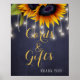 Cartes et cadeaux signe mariage avec un beau bouquet de tournesols et des cordes de lumières scintillantes sur un arrière - plan bleu marine de minuit. Parfait pour une nuit d'été ou d'automne mariage campagnard rustique élégant.