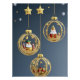 Baubles et ornements de Noël dorés et rouges sont élégamment accrochés à des rubans, créant une décoration festive et raffinée de vacances avec un arrière - plan bleu foncé aux subtiles flocons de neige.