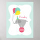 Cette affiche pour la nurserie présente une illustration d'un éléphant debout sur un ballon rose portant un chapeau sarcelle et tenant trois ballons dans sa trompe. La bordure est de couleur sarcelle clair. Personnalisez le nom.