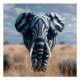 Cette affiche présente une représentation audacieuse et surréaliste d'un éléphant aux rayures noires et blanches distinctives d'un zèbre. Positionné de front, l'éléphant présente une composition imposante et symétrique, avec ses oreilles larges et ses yeux dirigés vers l'avant. Les bandes zébrées complexes recouvrent la peau, les oreilles et le tronc de l'éléphant, ce qui lui confère un contraste exotique avec l'herbe dorée et sèche de la savane qui se déplace doucement au premier plan. Les défenses de l'éléphant, d'un blanc immaculé contre le motif rayé, ajoutent un contraste naturel à l'image. Au-dessus, un ciel bleu doux avec des nuages épars laisse présager un environnement paisible mais sombre. Transformez votre espace avec ce poster captivant.
