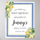 Le panneau de bienvenue parfait pour une douche de mariage sur le thème des citrons. Des citrons nichés dans des fleurs blanches et du feuillage vert sont entrelacés de carreaux bleus pour créer un cadre unique.