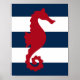 C'est un imprimé nautique formidable à accompagner de votre décor. Il dispose d'un hippocampe rouge sur un arrière - plan rayé bleu marine et blanc.
