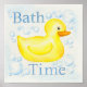 Un mignon canard en caoutchouc jaune entouré de bulles sur une affiche. Il est écrit Bath Time sur l'affiche. Parfait pour un baby shower canard en caoutchouc ! Obtenez une taille plus petite pour une impression encadrée de salle de bain.