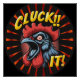 Une grande tête de coq est exposée de façon centrale avec des caractéristiques exagérées et des couleurs vives, accompagnée d'un texte jaune en gras "CLUCK! ! IT !" dans un design circulaire. L'arrière - plan présente des lignes rouges rayonnant vers l'extérieur sur un cercle sombre sur fond gris.