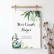 Cette enseigne de calligraphie de verdure avec une bougie qui brûle est parfaite pour un mariage tropical. Le design présente principalement des feuilles tropicales vertes.
