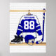 Un maillot de hockey sur glace personnalisé en bleu et blanc suspendu dans un vestiaire sportif avec casque, patins à glace et bâton de hockey sur glace. Le maillot peut être entièrement customisé avec le numéro et le nom de votre choix pour faire un grand cadeau pour le fan de hockey sur glace, joueur de hockey sur glace ou entraîneur de hockey sur glace. D'autres couleurs sont disponibles dans notre magasin et nous accueillons les demandes personnalisées pour différentes combinaisons de couleurs pour vos couleurs d'équipe. Contactez-nous via notre magasin avec votre demande avant l'achat et nous serons heureux de le créer pour vous.
