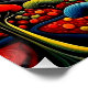 Une représentation vive et colorée d'une éruption volcanique domine la scène avec un ciel étoilé tourbillonnant et des coulées de lave stylisées. Au premier plan, une rivière sinueuse serpente à travers un paysage parsemé d'arbres arrondis et de collines ondoyantes, tandis qu'un ciel dynamique tourbillonne au-dessus de motifs audacieux