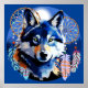 Beau loup aux yeux jaunes, avec des Dreamcatcters amérindiens, dans un paysage et Pleine lune de montagnes Bleues Sauvages. Logo original Vector Round Design isolé sur blanc Copyright BluedarkArt TheChameleonArt.