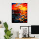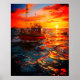 Cette affiche a un bateau au coucher du soleil dessus.