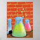 Expériences de Cartoon Science. Tubes d'essai et flacons de verre devant un mur de brique assis sur un banc en bois.