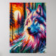 Un magnifique loup fait face avec le soleil brillant dans l'arrière - plan dans la forêt dans un design coloré. Parfait pour la maison, le bureau ou le présent.