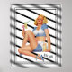 Fan Fair de American Painter Enoch Bolles (1883 - 1976); connu comme un illustrateur d'art à épingles de style glamour. Une belle fille pinup blonde séduisante bénéficie d'une belle brise cool d'un ventilateur à main électrique rose avec une cage jaune qu'elle tient dans sa main droite, qui est pointé sur son visage. Le ventilateur est muni d'un ruban vert qui indique que le ventilateur souffle de l'air dans la direction de son visage; et dans sa main gauche, elle tient un vieux cocktail de mode avec une cerise, une tranche d'orange, des cubes de glace et une double paille dedans, qui repose sur la table sur laquelle elle est assise; sa jambe gauche est penchée sur la cuisse droite de sa jambe courbée. Le portrait de la jeune dame la porte avec un haut rayé bleu et blanc avec la section du soutien-gorge tout blanc, avec pantalon court assorti et une jupe de bouton blanc, ainsi que des chaussures à talon et orteils ouverts rayés bleu et blanc ; qui sont également des semelles bleues et blanches. À l'arrière - plan blanc clair, j'ai décidé d'ajouter des lignes noires très espacées pour un attrait plus visuel et de séparer l'arrière - plan pour compléter ses vêtements.