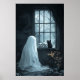 Scène d'Halloween avec un fantôme, un chat et des crânes