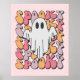 Ce design d'Halloween amusant et festif présente une illustration fantôme classique avant et centre, entourée du mot "Éffrayant" répété dans une police audacieuse et mousseuse. Le texte est superposé à des couleurs vibrantes et d'inspiration rétro, comme des roses douces, des violets et des oranges, créant un contraste ludique avec la simple silhouette blanche du fantôme. Les yeux noirs sans expressivité du fantôme apportent une touche de charme étrange, tandis que la typographie ondulée et empilée donne au design une atmosphère super et nostalgique.