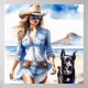 Cette belle affiche d'aquarelle sur le thème de la cowgirl côtière présente une fille en robe denim marchant sur la plage avec un chien. Les teintes bleues et blanches saisissent l'essence d'un été côtier. Cette illustration est parfaite pour cowgirl qui aime la plage, le thème de cowgirl occidentale, denim ou simplement le sentiment d'être libre. Il ferait un merveilleux ajout à n'importe quelle maison, bureau, ou dortoir.