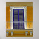 Fenêtre italienne et balcon, en bleu, encadré de pierre orange.