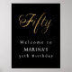 Un conseil d'accueil pour une fête du 50e anniversaire. Arrière - plan noir. Cinquante écrits avec un grand script en lettres d'or. Personnalisez et ajoutez un nom.