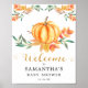 Panneau de bienvenue de fête de bébé citrouille aquarelle orange. Présentant une citrouille aquarelle reposant sur un lit de feuilles colorées d'automne et une police "Bienvenue" en or brillant. Personnalisez facilement et rapidement cette charmante petite affiche de bienvenue de citrouille.