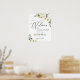 Accueillez vos invités à votre mariage avec l'Affiche de bienvenue pour une baby shower aux roses blanches et à la verdure florale, avec une verdure botanique aquarelle luxuriante et des fleurs blanches, avec "bienvenue dans notre bonheur éternel", vos noms et la date du mariage dans un mélange chic de typographies modernes et de calligraphie manuscrite.