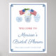 Des fleurs bleues et blanches classiques et des drapeaux américains dans un vase en forme de pot au gingembre ornent le design de ce panneau de bienvenue à la fête. Illustré ici pour un enterrement de vie de jeune fille, mais tout le texte peut être personnalisé selon vos besoins. En ce qui concerne la bordure à la grecque, vous pouvez changer sa couleur en modifiant la couleur de fond du design (entrez dans l'outil de conception en cliquant / en appuyant pour personnaliser davantage). Si vous avez besoin de l'affiche dans un autre format (différent de 2:3), vous devrez peut-être ajuster cette bordure pour qu'elle reste à la bonne distance du bord. Pour ce faire, sélectionnez l'un des calques intitulés "coin de la clé grecque..." et utilisez les flèches de votre clavier pour vous déplacer vers la gauche ou la droite). Vous devrez faire chaque moitié de l'arrière