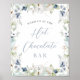 Poster de douche nuptiale "Hot Chocolate Bar" pour une douche nuptiale hivernale avec cadre floral bleu poussiéreux et police de caractères élégante.