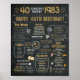 Poster Flashback pour le 40e anniversaire Une affiche numérique chargée de faits, de données et de faits saillants amusants de ce qui s'est passé en 1983! L'or et le blanc sur un arrière - plan de "texture de tableau noir" - des défauts font partie du design pour le rendre unique et réaliste. Ces affiches font une excellente pièce de conversation pour votre prochaine réunion ou fête! Ajoutez un tapis et un cadre et vous avez un beau gardien d'anniversaire.