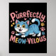 Ce charmant graphisme présente un chat rayé bleu et blanc contenté dans une position ludique et accroupissante, avec des yeux jaune vif et une expression joyeuse et ouverte. Le texte en gras ci-dessus, "Purrparfaitement MEOW-VELOUS", est rendu dans des teintes rose joyeuses, accentué par des coeurs flottants et des empreintes de pattes dans différentes couleurs, ajoutant au thème joyeux. Le design est fixé sur un arrière - plan noir solide. Téléchargement numérique à usage personnel uniquement.