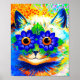 Affiche mettant en vedette la peinture animale de Louis Wain Cat Flower Eyes (1860-1939). Un chat arc-en-ciel grince largement. Des fleurs bleues recouvrent ses yeux. Un cadeau merveilleux pour l'art amoureux des chats et anglais.