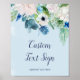Ce panneau de texte personnalisé avec des fleurs blanches classiques et un bébé en bleu est parfait pour un événement printanier. Le design floral élégant présente des roses ivoire et blanches, des pivoines et des chrysanthèmes avec des touches de fleurs de couleur bleu pervenche à l'aquarelle et du feuillage vert. Personnalisez le texte pour dire tout ce que vous voulez ! Ce panneau peut être utilisé pour les cartes et les cadeaux, le livre d'or, le hashtag de mariage, les faveurs, le bar à dessert - tout ! Il peut être utilisé pour un mariage, une douche de mariée, un dîner de répétition ou tout événement. La ligne de texte au bas du panneau peut être personnalisée avec la date ou un court message comme "Merci". Si vous souhaitez plusieurs panneaux coordonnés, personnalisez et ajoutez-les à votre panier un à la fois.