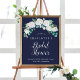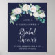 Cette affiche classique de fleurs blanches marine douche nuptiale d'accueil est parfaite pour une douche mariage de automne. L'élégante décoration florale est composée de roses blanches et d'ivoire, de pivoines et de chrysanthèmes, avec des touches de fleurs d'aquarelle bleu périvent et de feuillage vert. Customisez l'affiche avec le nom de la mariée, jours jusqu'au mariage, la date de la douche et le hashtag optionnel sur les médias sociaux pour les photos.