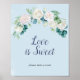 Ce panneau de mariage classique à fleurs blanches et amour bleu est parfait pour un mariage de printemps. Le design floral élégant présente des roses ivoire et blanches douces, des pivoines et des chrysanthèmes avec des touches de fleurs de peinture aquarelle bleu pervenche et de feuillage vert. Personnalisez le texte pour dire ce que vous voulez !