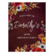 De belles fleurs d'automne décorent les deux coins de ce signe de bienvenue de fête d'anniversaire. Roses rouges, fleurs en terre cuite et pivoines blanches se mêlent aux feuilles verts et aux feuillages. Les fleurs et le blanc script moderne pop contre l'arrière - plan rouge bordeaux. Cet article fait partie de la collection Bourgogne Fall Flowers.