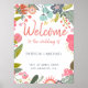 Fleurs mariage affiche d'accueil modèle avec une jolie couronne de fleurs dessinée à la main dans les tons rouge corail, bleu océan, vert fougère et sauge, jaune vif et rose vif avec fleurs et feuillage et avec un texte de typographie brossée moderne chic changeable. ++++++++++++ Le signe est idéal pour le printemps rustique ou l'été | jardin fleuri | élégantes réceptions de mariage en plein air ou en jardin.