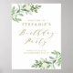Bienvenue aux invités à votre événement avec ce signe de bienvenue personnalisable fête d'anniversaire. Il est doté d'une verdure aquarelle et de fleurs blanches avec calligraphie blanche. Personnalisez en ajoutant vos détails. Ce signe d'anniversaire verdoyant est parfait pour les anniversaires du printemps et de l'hiver.