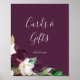 Ce panneau à l'aspect sombre "fleurs de prunier violet" pour cartes et cadeaux est parfait pour un mariage moderne ou une fête de mariage. Le design floral élégant présente des fleurs de tulipes violettes prune foncé et blanches avec des feuilles vert émeraude et des accents de feuilles dorées. La ligne de texte au bas du panneau peut être personnalisée avec la date, les noms de la mariée et du marié, ou un court message comme "Merci". Ce panneau peut être utilisé pour un mariage ou tout événement ou fête.