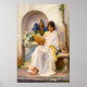 Flora by John William Waterhouse presents a quiet, intimate vision of classical beauty and springtime abundance. A young woman in flowing white drapery sits in a sun warmed stone setting, her posture relaxed yet thoughtful as she studies a decorated fan. Around her, fresh flowers spill across the ledge in pale whites and deep blues, turning the space into a small shrine to the season. A golden statue behind her strengthens the mythic atmosphere, suggesting an ancient garden where art, ritual, and nature meet. Soft light plays across the fabric’s folds and the textured wall, while the delicate contrast of cool blossoms and warm skin tones gives the scene a calm, luminous harmony. The overall mood is contemplative and tender, like a paused moment of spring held in paint.