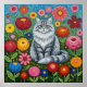 Poster Fluffy Gray Striped Cat with Folk Art Flowers