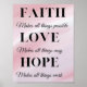 De la lumière des coups de pinceau, les tons rose délicats font ressortir le texte de Foi, Espoir et Amour sur cette affiche.