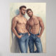 This serene illustration depicts two male figures in a tranquil forest setting, rendered in a distinct mid-century graphic style that evokes classic children's book illustrations or vintage travel posters. The artistic technique features clean lines, simplified forms, and a muted yet harmonious color palette, emphasizing light filtering through the trees. The subjects are two young men with idealized, athletic builds and neat, styled hair. They stand facing each other, one looking directly at his companion with a gentle smile, while the other looks upwards, lost in thought, creating a sense of quiet intimacy and shared natural beauty. Both figures are depicted in simple white briefs, their forms subtly highlighted by the dappled light of the forest. This piece beautifully blends nostalgic illustration with a serene narrative, appealing to those who appreciate classic graphic design and a gentle, contemplative depiction of male connection within nature.