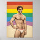 This striking, full-body illustration features a single, muscular male figure, expertly rendered in the clean, idealized style of vintage pin-up and magazine art from the mid-20th century. The artistic technique utilizes smooth, highly controlled rendering and luminous, warm lighting, creating an aspirational image of perfect health and confident masculinity. The subject is a handsome man with neat, short, styled hair. He is depicted with a determined yet charming expression, looking directly at the viewer with an inviting gaze. He possesses an exceptionally chiseled and defined physique, showcasing broad shoulders, prominent chest muscles, and a toned abdomen, embodying the era's ideal of physical fitness. He is clad only in simple white briefs, focusing all attention on his powerful form and confident stance. This artwork is a compelling celebration of confident masculinity, rendered with the optimistic flair and iconic visual clarity of a classic, timeless illustration.