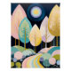 Un tableau éthérée et symbolique représentant une scène forestière stylisée et abstraite. De grands arbres en forme de larme aux branches épineuses dominent la partie supérieure de la toile, dont les toiles sont habillées de douces nuances de rose, de turquoise et d'or, dont certaines présentent des détails chatoyants sur les feuilles d'or. Un corps céleste, un grand orbe aux anneaux concentriques de bleu, de violet et de jaune, est suspendu dans le ciel bleu profond. Au premier plan, un paysage vallonné de collines arrondies dans différents pastels, traversé par un chemin sinueux aux couleurs arc-en-ciel. L'impression générale est celle d'un paysage onirique, mystique, rempli de couleurs vives et de formes géométriques.