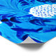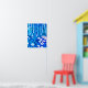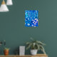 Affiche dans une illustration semi-abstraite d'une forêt fantastique avec des fleurs, du feuillage, des arbres et des oiseaux, dans des nuances de bleu cobalt et de blanc