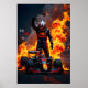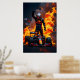 A Formula 1 driver in a Red Bull racing suit stands triumphantly on his car amidst a dramatic explosion of fire and smoke. Clear details and vibrant colors enhance visual appeal.