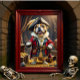 Cette charmante image est ornée d'un Bulldog français blanc et bronzé, régallement habillé en capitaine de pirate, avec un casquette tricorne en plumes et un manteau rouge élaboré orné de garnitures bleu foncé et d'accents dorés. La canine distinguée se tient en confiance avec une patte sur un coffre fermé au trésor, entouré de pièces d'or éparpillées. Son expression ludique ajoute de la personnalité à ce portrait aventureux et royal.
