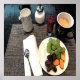 Fruits et café Petit déjeuner tranquille de raisins, cantaloupes, savoureux jus de fraise et tasse de café lors d'un voyage en Allemagne. Par celeste@khoncepts.com